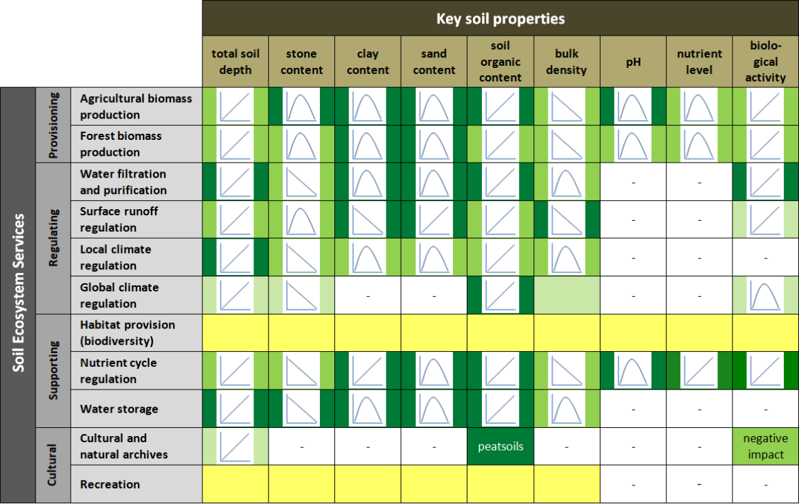 This estimation tool can be used in the field at a soil profile to estimate the contribution of soils to eleven selected ecosystem services. In particular, it illustrates how key soil properties, which may change under different land uses and management strategies, impact the individual ecosystem services.