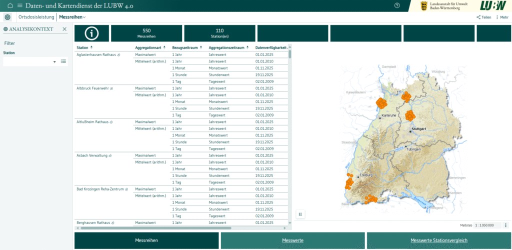 The LUBW 4.0 data and map service provides interactive access to freely available environmental data and digital data sets. The data originates from LUBW measurement and investigation programmes and from the information network of municipal and state environmental agencies in the state of Baden-Württemberg.